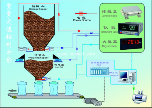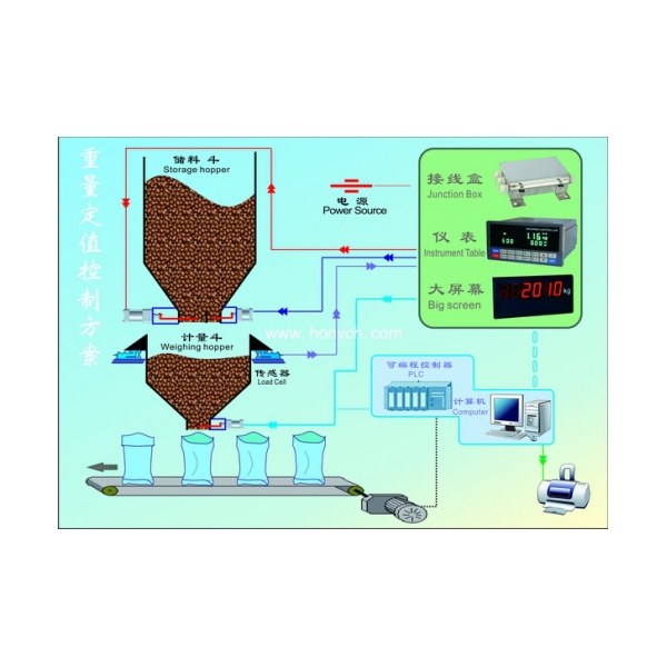 接線盒和稱重儀表組成,稱重傳感器安裝在計量斗上,用于稱取流入計量斗的物料重量值并傳到至稱重儀表內,稱重傳感器使用3-4支,通過接線盒將信號進行串聯,稱重儀表控制投料機構開始、停止、使用快、中、慢三種速度投料,直至達到目標值,也可通過485通訊接口跟PLC進行通訊,由PLC控制執行器進行操作。